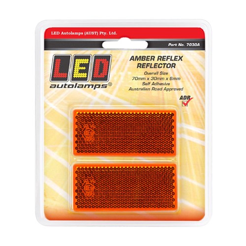 2 x Amber reflectors in blister pack self adhesive 70mm x 30mm x 6mm. ADR approved CRN No 38101