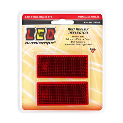 2 x Red reflector in blister pack self adhesive 70mm x 30mm x 6mm. ADR approved CRN No 38102