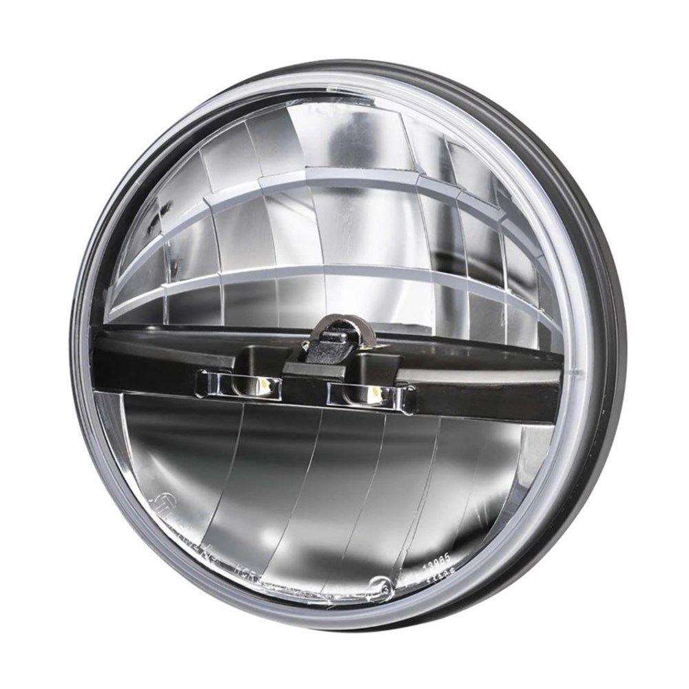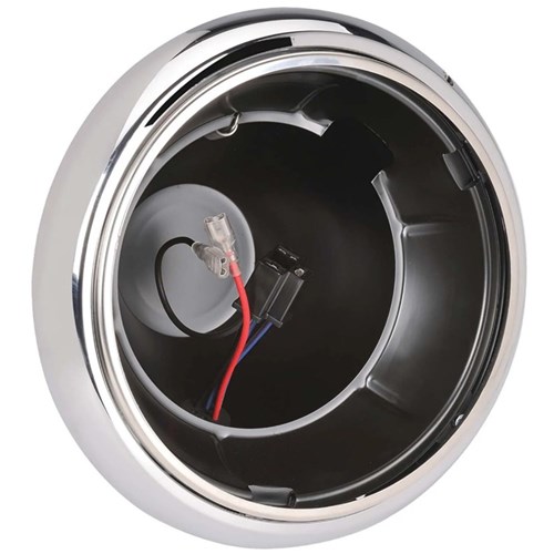 With Stainless Steel Retaining Ring and Chrome Trim. Designed specifically to fit both halogen and L.E.D 7” headlamp inserts. Features adjusting screws for precise headlamp alignment pre-wired connectors corrosion resistant stainless steel retaining ring and a stylish chrome trim to compliment modern vehicles. Direct fit with no "modification for replacement of existing 7"" closed buckets."