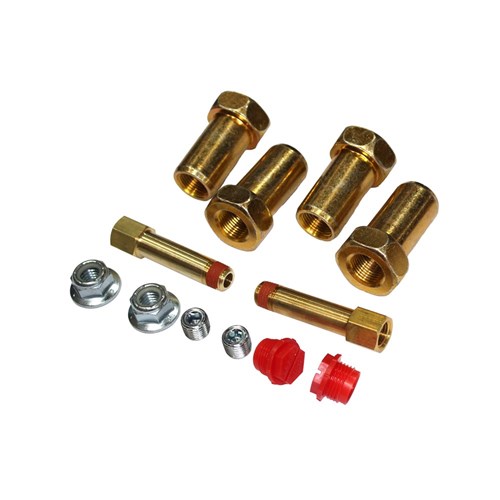 Air spring mounting hardware kit. Includes four 3/4" extended nuts, two extended 1/4" fittings, two 1/2" flanged nuts and two 1/4" NPT plugs.