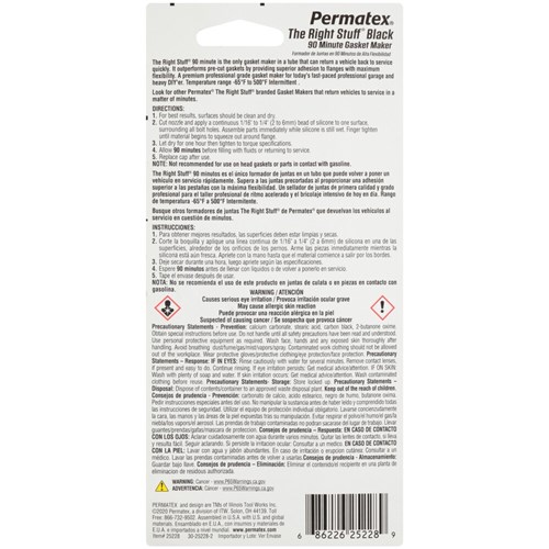 Designed specifically to provide excellent durability for newer domestic and import vehicles that typically have closely-spaced bolt patterns, The Right Stuff 90 Minute Black outperforms conventional pre-cut gaskets by delivering an exceptionally strong and fast seal. It is blow-out resistant and can be used on applications including valve covers, intake manifolds, coolant flanges, oil pans, and timing covers.