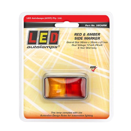 Chrome 10volt-30volt Red Amber Side Marker in blister pack with 2 LED's 35mm x 58mm x 21mm with 40cm wire. ADR approved CRN No 36841