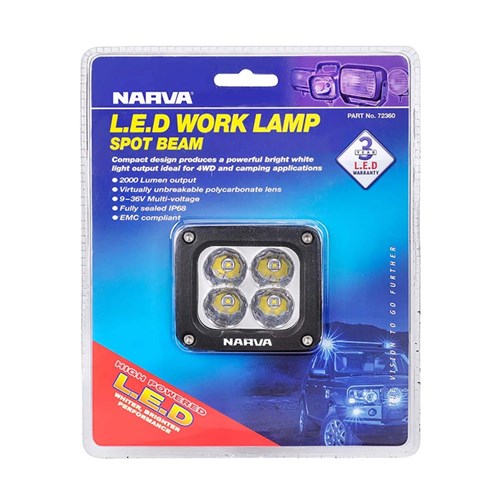 Narva's 4x4 work lamps are compact, rugged and versatile, punching out powerful bright white light for adventurers. Part no: 72360 produces a spot beam pattern designed for a more focused illumination. L.E.Ds come backed by Narva's 3 year L.E.D warranty for peace of mind.